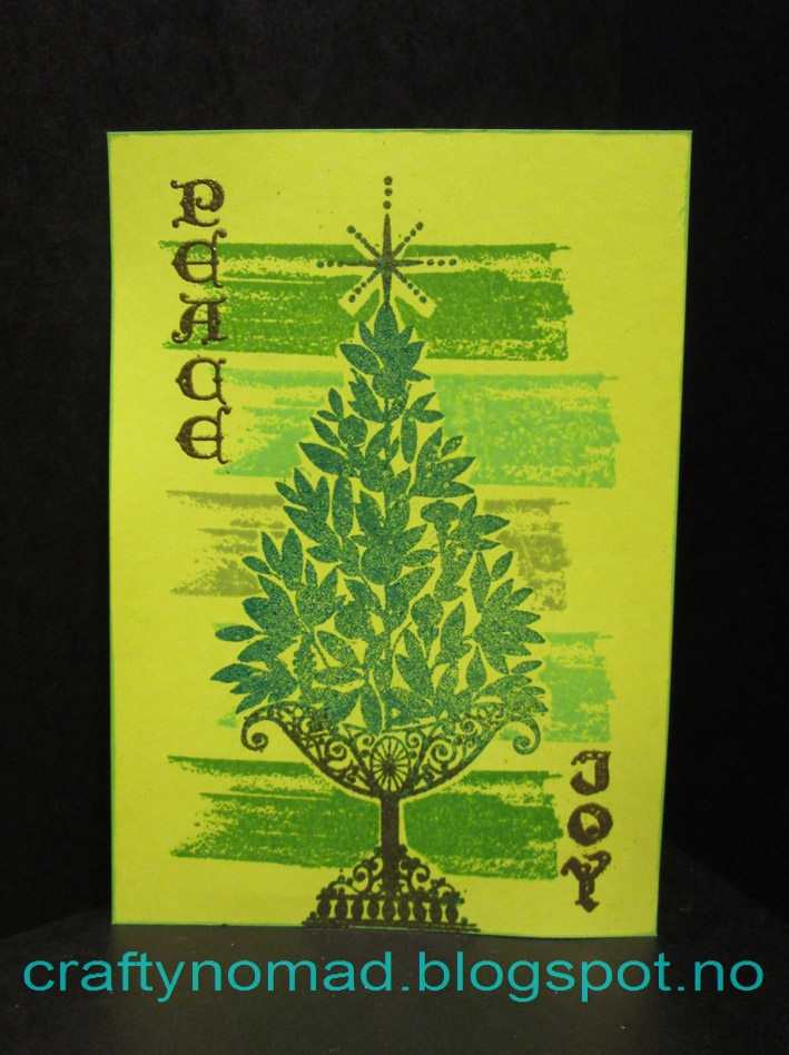 I know, it's a bit bright. Well, I also wanted to join the One Layer Christmas Card challenge where the twist this time is Green. So I picked a yellow base card and various shades of Distress ink. I was going to stamp the background and then add a fussy cut detail til I remembered I was trying for one layer!!! So I stamped the Paperartsy tree with Pine Needle distress. A little late I decided to try and emboss the star and basket with gold and the tree with green powder. The gold is patchy. Which I like. Sort of distressed. The green is almost not there at all. Just a little texture here and there. I quite like that as well. Then I masked and stamped the background.