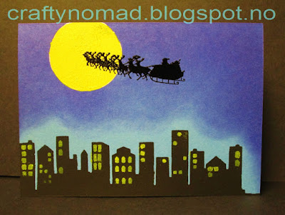I used the Downtown Border cut as a stencil and sponged yellow acrylic for the lights in the buildings and the moon. I stamped Crafty Individuals Santa Sleigh stamp and embossed with black powder. I liked this enough to make a couple the same and since the masks were cut it was actually quite quick to reproduce. Think I may need to cut the masks from something other than card though. The city lights are a bit irregular. Maybe it's frosty LOL.