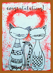 I played with the Purr-fect set. I stamped a cat, masked, stamped a cat and masked. Then I stamped the large heart from Arty Hearty using Festive Berries distress ink and used the edge of the heart stamp to add the red flecks. I stamped the Congratulations from Beautiful Words and done!! Did I mention cute????